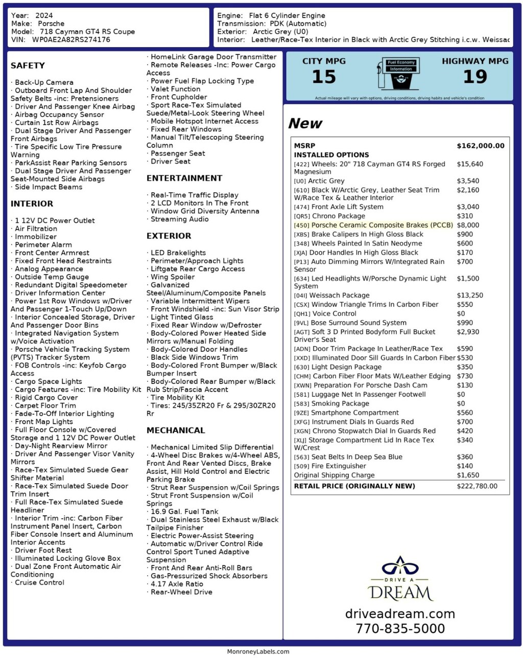 - Wheels: 20" 718 Cayman GT4 RS Forged Magnesium$15,640
